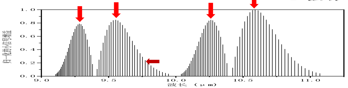 通常CO2激光器波長是10.59mm,這只是CO2激光增益譜中最強的一條譜線。從圖2-3 CO2激光器的譜線圖中可以看出,實際上有四條譜線的增益都比較大,分別為10.59mm、10.25mm、9.55mm及9.27mm。以上四條譜線為各支的強線。但是在很多應用需求中,除輸出這四條強線外還要求輸出某些增益很低的弱線,且實際應用中還需要很高的光束質量,因此有較大的研制難度。