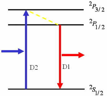 半導體泵浦堿金屬蒸氣激光器(DPAL,Diode Pumped Alkali vapor Laser),是由半導體激光器(LD,Laser Diode)作為泵浦源,堿金屬飽和蒸氣作為激光的增益介質以實現高功率的激光輸出。堿金屬元素包括鋰(Li),鈉(Na),鉀(K),銣(Rb),銫(Cs),它們最外層只有一個價電子,表現出相似的能級結構如圖2-6所示。2S1/2為基態能級,2P1/22P3/2為自旋-軌道相互作用而劈裂的激發態能級,其中2P1/2  2S1/2躍遷對應D1譜線,稱為激光躍遷;2S1/2  2P3/2躍遷對應D2譜線,稱為抽運躍遷,對堿金屬蒸氣進行抽運就是要實現2S1/22P1/2能級之間的粒子數反轉。