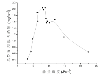 圖3-5 單位面積除漆質量隨激光能量密度的變化曲線