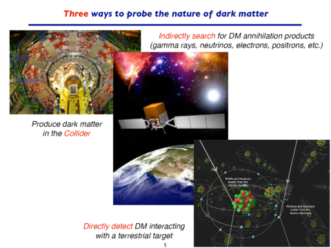 · 間接探測方法:測量暗物質粒子湮滅所產生的次級粒子。如 γ光子,正負電子e+ e-, 中微子。