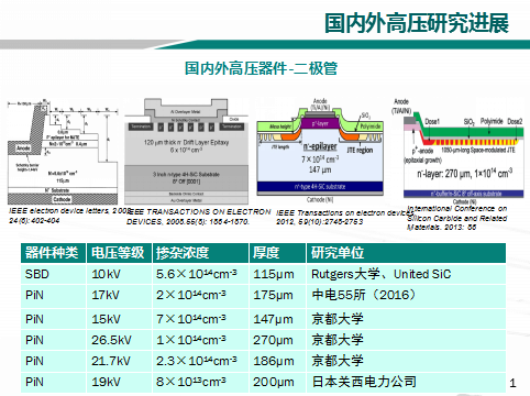 雖然在低壓領(lǐng)域SiC已經(jīng)進(jìn)入產(chǎn)業(yè)。但是在高壓領(lǐng)域,不管是國(guó)內(nèi)還是國(guó)外都還處于研發(fā)階段。由于材料的優(yōu)勢(shì),國(guó)外的研發(fā)進(jìn)度要領(lǐng)先一些,日本京都大學(xué)在3年前就研發(fā)了26.5kV的PiN二極管,美國(guó)的Cree公司在也在3年前就研發(fā)了20.7kV的IGBT。國(guó)內(nèi)在引進(jìn)先進(jìn)的厚膜外延設(shè)備后,厚膜外延材料制備技術(shù)得到進(jìn)步,最近也在高壓器件方面做了一些成績(jī),比如中電55所在2016年報(bào)道了17kV 的PiN二極管,在2018年報(bào)道了12kV 的IGBT,說(shuō)明國(guó)內(nèi)材料在一步步進(jìn)度,器件的差距也和國(guó)外漸漸縮小。