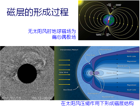 地球有磁場,但在太陽風(帶電粒子)的吹動下,地球磁場變成現在的樣子。太陽的輻射產生光化學作用,高層的電離層以及接近地面的大氣等,都受到了影響。中高層大氣位于地球上方30-100公里,這里空氣稀薄、開始電離、熱源和熱匯復雜。電離層位于地球上方60-1000公里,這里的空氣部分電離、有中性和帶電粒子共同作用、影響無線電波。磁層位于地球上方1000公里到幾十個地球半徑,這里的空氣完全電離、空間等離子體完全受磁場控制。