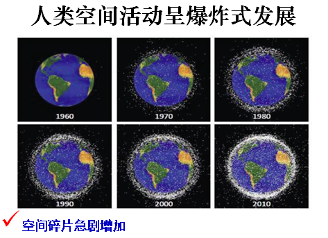 當前,有各種飛行器在空間運行,空間充滿了飛行器、衛星、退役產生的碎片。從下面的圖中可以看到,在1960年和2010年間,地球表面飛行物的比較,在2010年的地球空間充滿了太多的飛行物等。