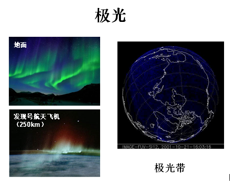 太陽風的暴發,發生地球空間暴,會引起高能粒子暴,磁場擾動,形成磁暴,產生電離層暴和熱暴。太陽風吹向地球,使磁場偏轉,會在地球的南北極形成美麗的極光。圖中顯示的極光,有從地面看到的,有從距地球表面250公里的航天飛機上看到的。