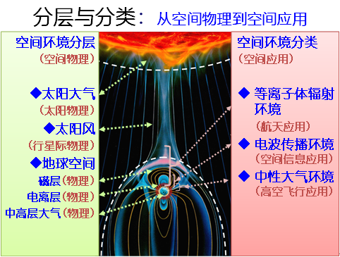 首先介紹日地空間的一些常識。在太陽表面的部分稱作太陽大氣,就是太陽物理。在太陽和地球之間,存在太陽風,又稱作行星際物理。在距地球附近,稱作地球空間。地球空間又有磁層,在距地球1000公里以上,處于等離子體輻射環境,與航天應用有關。在距地球60-1000公里之間,存在電離層,與空間信息應用有關,屬于電波傳播環境,在飛行物飛行期間,需要通訊、導航、定位等。在距地球30-100公里間,屬中高層大氣,又叫中性大氣環境,高空飛行物如導彈在這一層飛行。