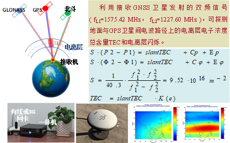 利用接受GNSS衛星發射的雙頻信號,可探測地面與GPS衛星間電波路徑上的電離層電子濃度總含量TEC和電離層閃爍。