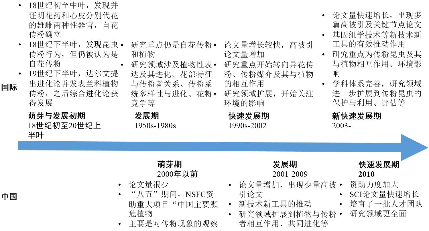 由于傳粉昆蟲的重要性以及目前所面臨的危機已經引起科學家和民眾的廣泛關注。諸多地區級、國家級乃至全球級別的傳粉研究已經取得了階段性的成果。就全球范圍來說,傳粉昆蟲的研究主要包括四個時期,分別為:1)萌芽與發展初期(18世紀初到20世紀上半葉);2)發展期(20世紀下半葉);3)快速發展期(20世紀90年代起至21世紀初);4)新快速發展期(2003年以后)。