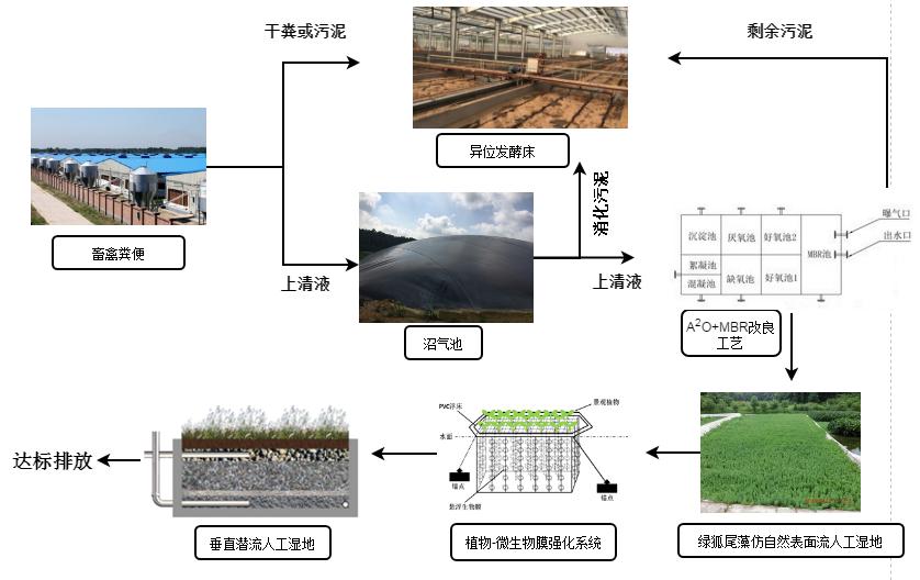 而針對我國規模化養殖場來說,近些年來大多采用固液分離—厭氧發酵—好氧曝氣傳統三段式工業處理模式處理養殖廢水,即理、化并用技術。該處理模式具有占地小、季節適應性強以及可產出部分能源氣體(沼氣)等優點。但同時也存在投入、運行成本高,有機物和氮的去除不徹底,除磷工藝缺乏等缺點。隨著《畜禽養殖業污染物排放標準》(征求意見稿)的逐步落實,現行的畜禽養殖廢水處理工藝大多已無法滿足新標準的排放要求。