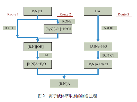 離子液體萃取劑的制備過程如圖2所示,包括將季錢鹽[R4N ]C1制備成季錢堿[R4N ]OH,然后與有機酸HA反應生成[R4N]A。或者將有機酸HA與堿反應生成A一Na,然后與[R4N ]C1反應生成[RQN]A。前一個制備過程,尤其是利用KOH更加簡單、低成本,產品的純度高。此外,離子液體萃取劑制備過程簡單,反應時間短,條件溫和,產品收率高,適合大規模的生產。申請者利用工業原料N263 ( Aliquat336的國產化的商品)與P507制備的[A336][P507]價格僅為170元/千克左右。另外,離子液體萃取劑性質穩定,經過多次循環仍保持其萃取性能。此外,其水溶性較低,溶解度一般小于50ppm。這些都符合大規模工業應用的潛在條件。